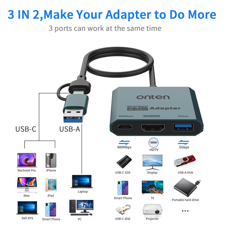 Adapter USB Flash 3u2 USB-A + USB Type-C na HDMI 4K 60Hz + USB 3.2 + USB Type-C 480Mbps 30cm (OTN-UCA303) Onten