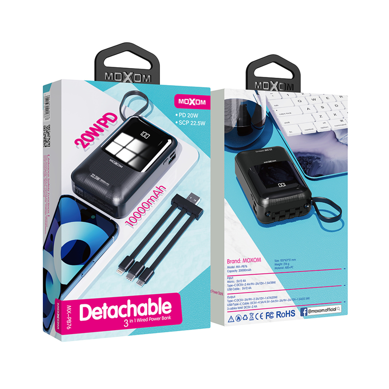 Power bank Moxom MX-PB76 10000mAh 20W PD LCD 3 in 1 sa kablom crni